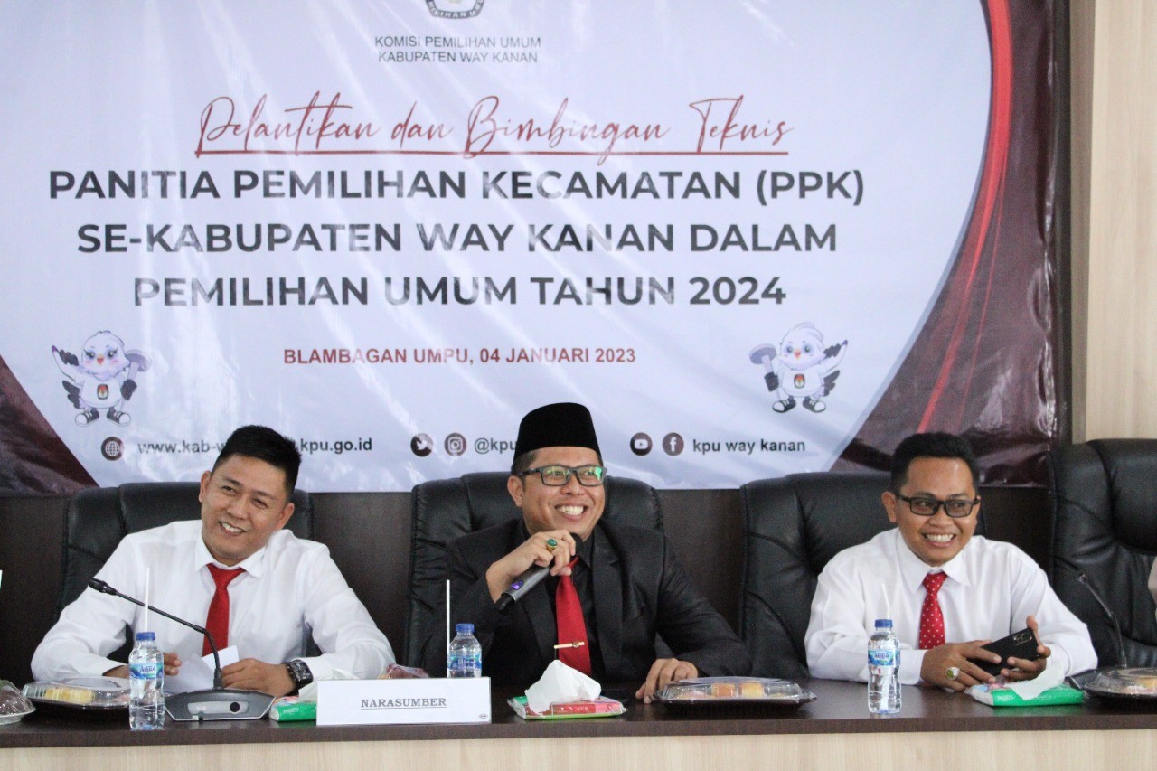 Refki dharmawan,S.H dalam sambutannya mengucapkan selamat kepada seluruh PPK Se-Kabupaten Way Kanan yang sudah dilantik dan diambil sumpah janjinya untuk pemilu tahun 2024.