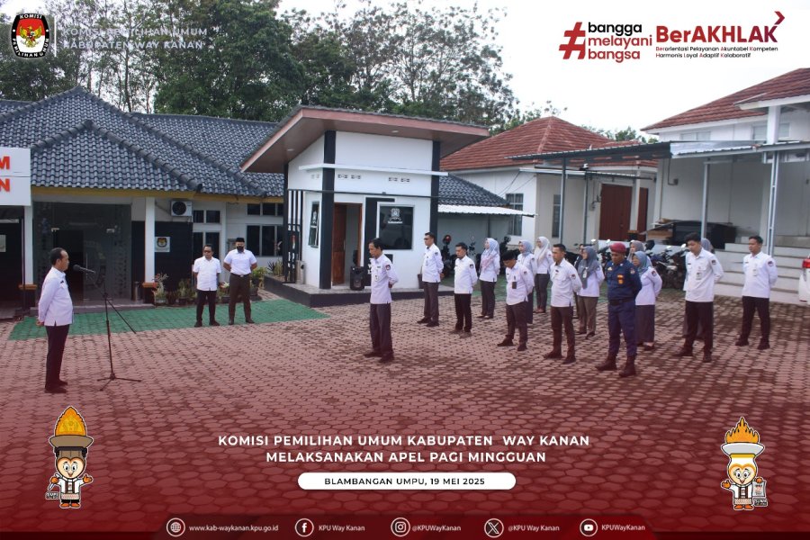 Komisi Pemilihan Umum Kabupaten Way Kanan Laksanakan Apel Rutin Mingguan pada hari Senin 19 Mei 2025 di Halaman Kantor KPU Kabupaten Way Kanan, Selaku Pembina Upacara adalah Ketua KPU Kabupaten Way Kanan Haritul Pasya.