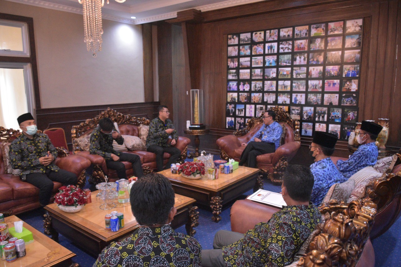 Ketua KPU Refki Dharmawan bersama Anggota KPU I Gede Klipz, Doan Endedi, Tri Sudarto, Noprisyah Harianto dan Sekretaris Arifin diteeima Bupati Way Kanan Raden Adipati Surya didampingi Kepala Badan Kesbangpol Pardi.