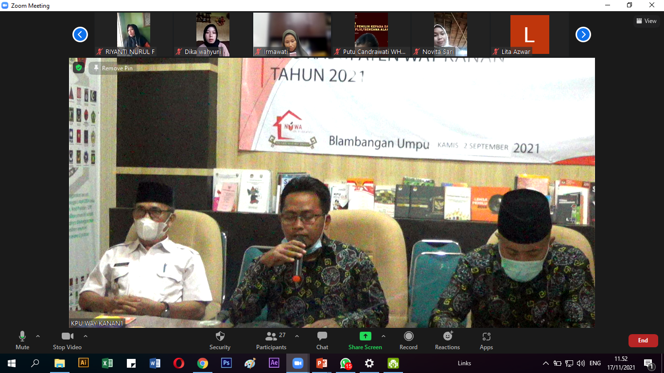 Blambangan Umpu, Rabu 17 november 2021 bertempat di nua demokrasi KPU Way Kanan melaksanakan Webinar Pendidikan Pemilih melalui aplikasi Zoom Meting, dengan peserta pemilih berbasis pemilih perempuan yang ada dikabupaten Way Kanan Yang tergabung dalam organisasi,Fatayat,Nasyiatul Aisyiyah,Kopri, Kohati dan WHDI.