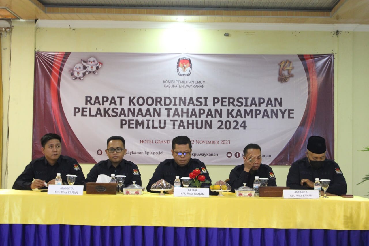 KPU Kabupaten Way Kanan menggelar Rapat Koordinasi Persiapan Pelaksanaan Tahapan Kampanye Pemilihan Umum tahun 2024, bersama Partai Politik, Stakeholder terkait dan PPK Se kabupaten Way Kanan, di Hotel Grand Sinar Kecamatan Umpu Semenguk, Rabu (22/11/2023).