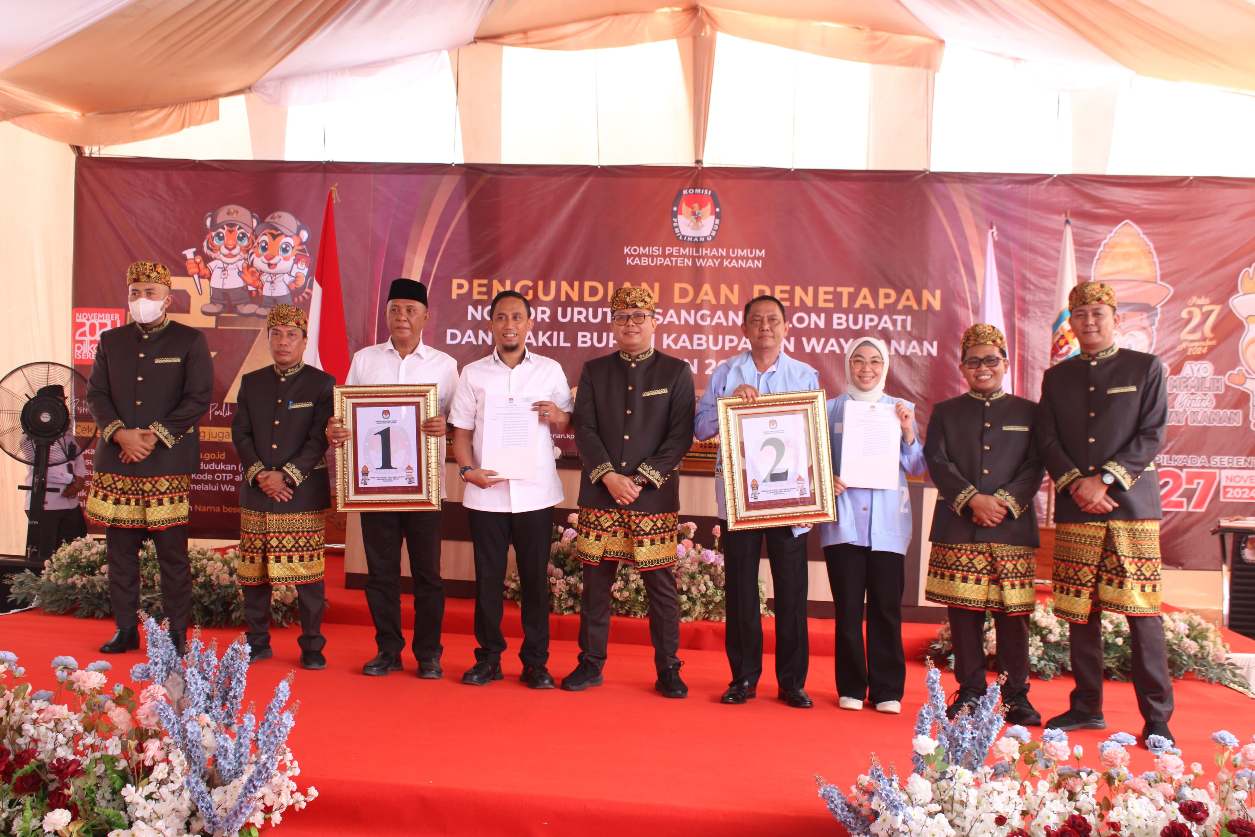 Komisi Pemilihan Umum (KPU) Kabupaten Way Kanan menggelar Pengundian dan Penetapan nomor urut pasangan calon bupati dan wakil bupati Kabupaten Way Kanan Tahun 2024, Pengundian nomor urut dilaksanakan di halaman Kantor KPU Way Kanan, Senin 23 September 2024.