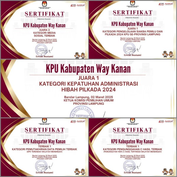 Lima kategori penghargaan yang berhasil diboyong oleh KPU Way Kanan meliputi: ???? Juara 1 Kategori Pengelolaan SIAKBA Pemilu dan Pilkada 2024, ???? Terbaik 1 Kategori Pengunggahan C Hasil Terbaik, ???? Terbaik 1 Kategori Pemutakhiran Data Pemilih, ???? Juara 1 Kategori Kepatuhan Administrasi Hibah Pilkada 2024, serta ???? Juara 2 Kategori Media Sosial Terbaik. Capaian ini merupakan hasil dari kolaborasi solid antara anggota KPU, jajaran sekretariat, dan penyelenggara adhoc hingga tingkat desa yang telah bekerja keras dalam setiap tahapan proses kepemiluan.