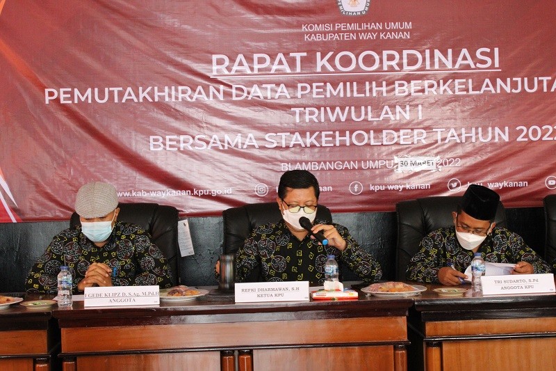 Blambangan Umpu, Rabu, 30 Maret 2022, KPU Kabupaten Way Kanan Melaksanakan Rapat Koordinasi Pemutakhiran Data Pemilih Berkelanjutan (PDPB) Triwulan I Periode Bulan Maret 2022 di Aula KPU Way Kanan.
