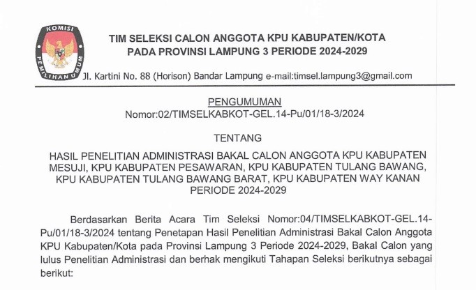 Berikut Kami Umumkan Hasil Penelitian Administrasi Bakal Calon Anggota KPU Kabupaten Kota Periode 2024-2029