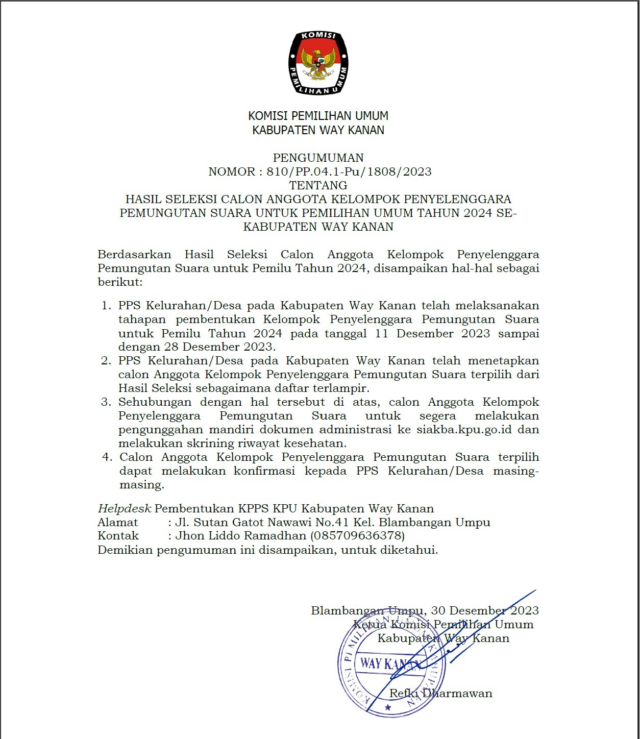 PENGUMUMAN HASIL SELEKSI CALON ANGGOTA KPPS PEMILU 2024 KABUPATEN WAY KANAN