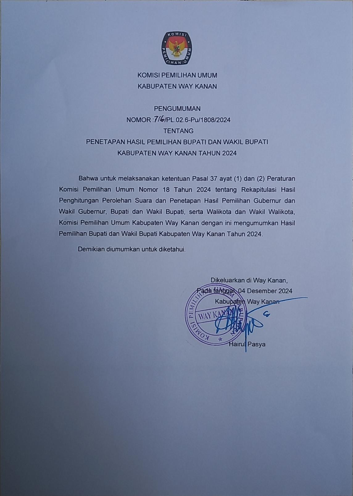 PENGUMUMAN PENETAPAN HASIL PEMILIHAN BUPATI DAN WAKIL BUPATI KABUPATEN WAY KANAN TAHUN 2024